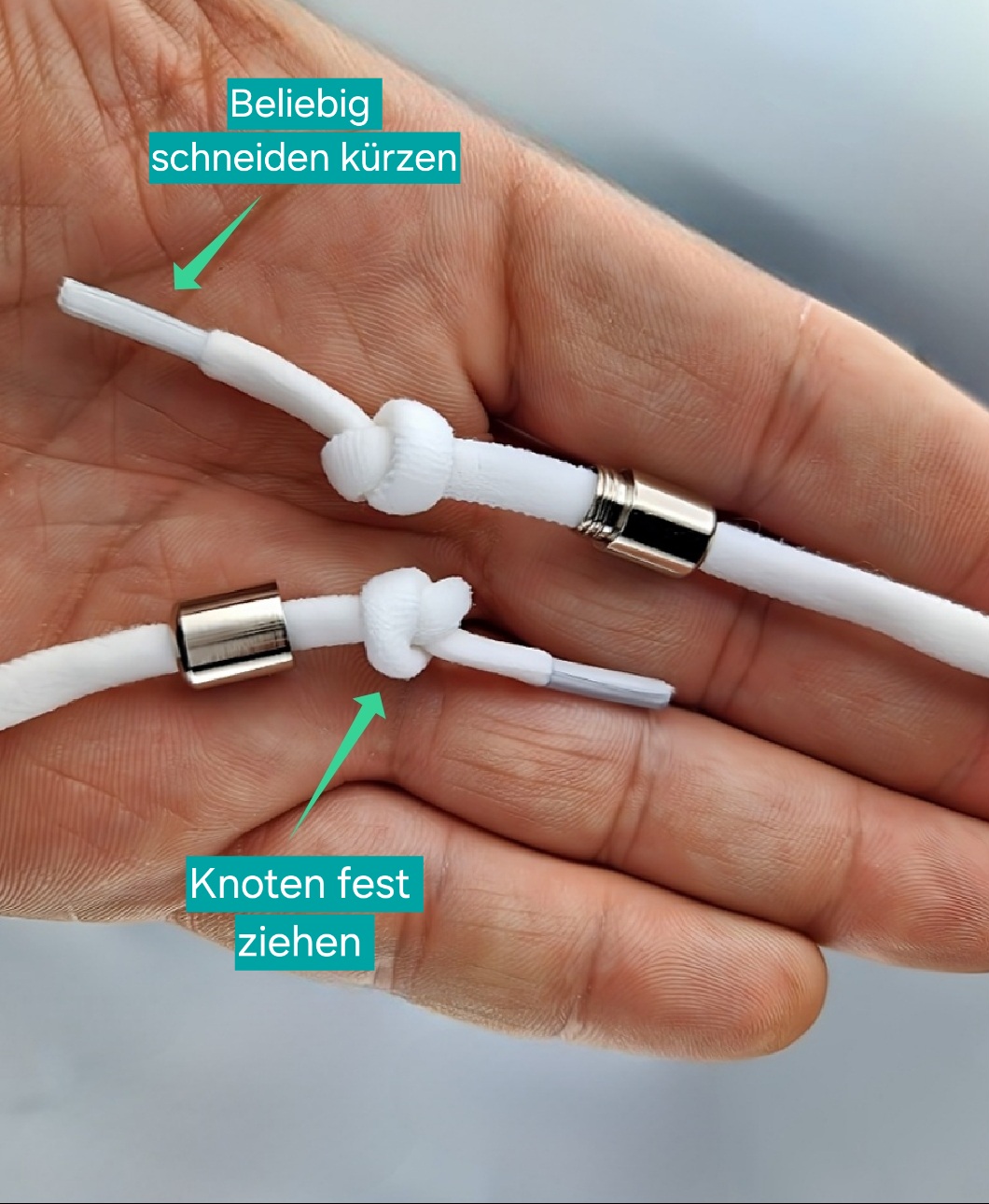 Anwendung: Die Schnürsenkel durch den Kapsel ziehen,einen festen Knoten machen,die Spitze zuschneiden und den Knoten in den Kapsel reinstecken.