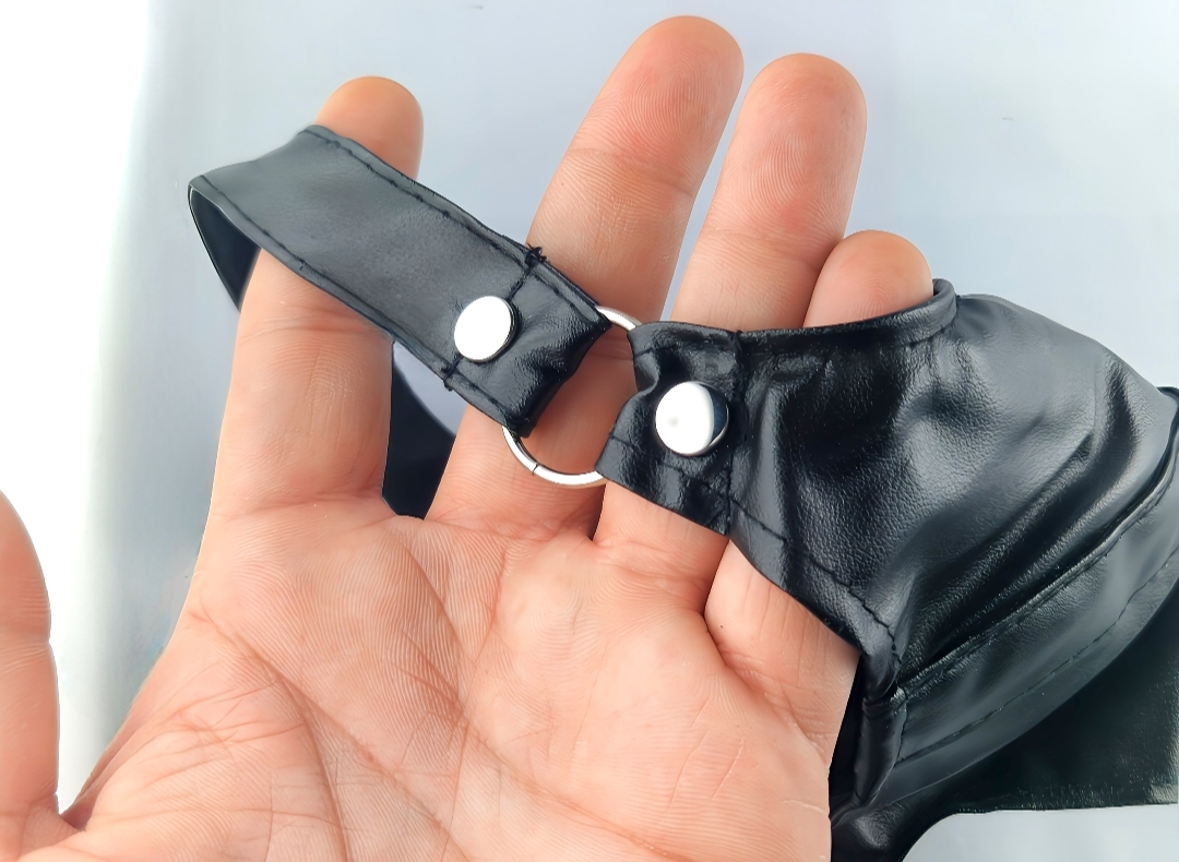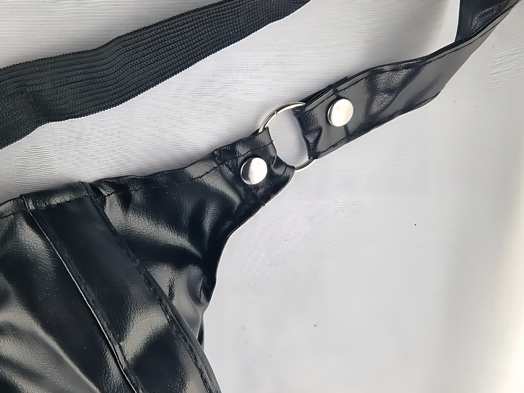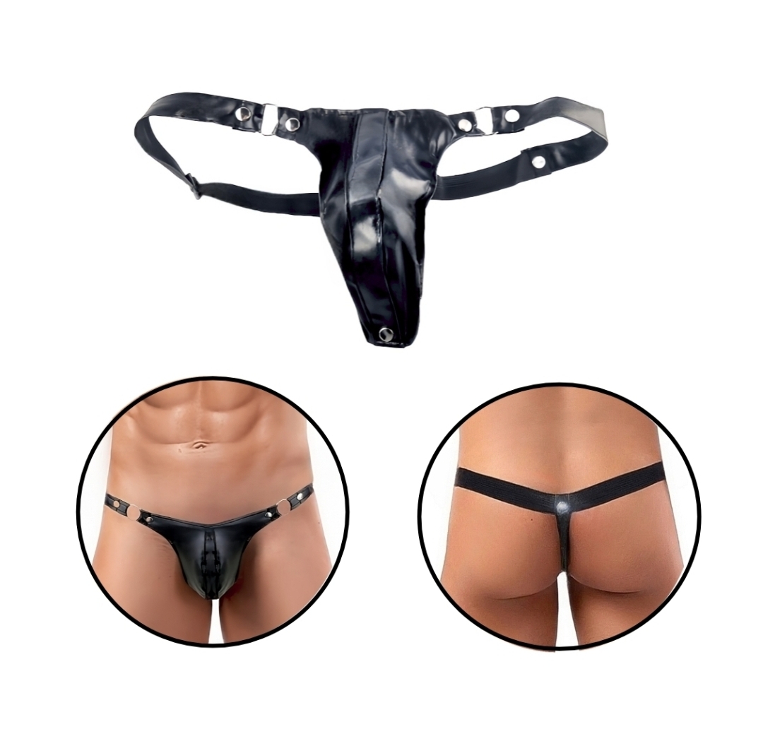 Männer Unterhose G-String Lederoptik Schwarz mit Ringe und Metallknöpfe an den Seiten.