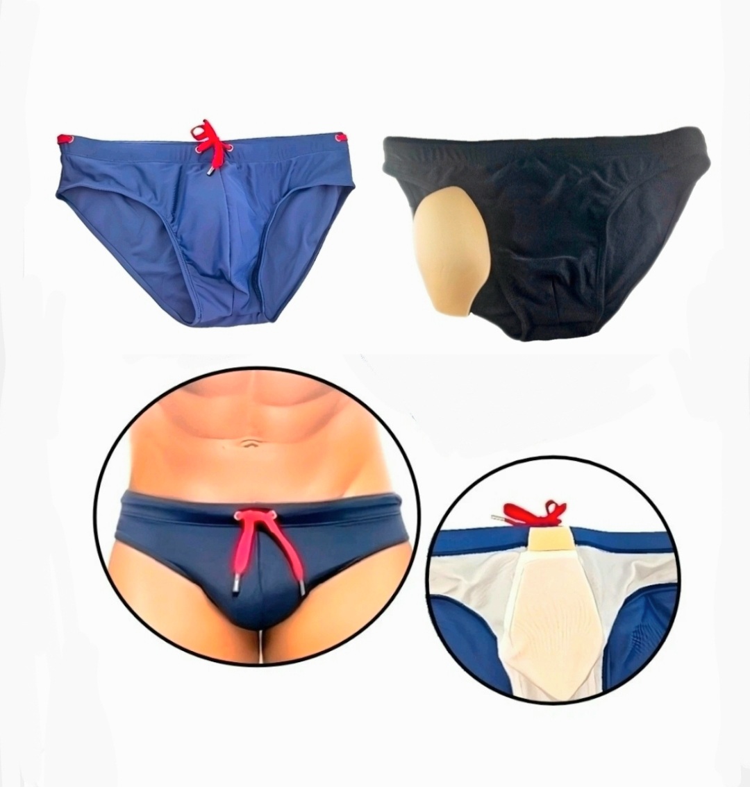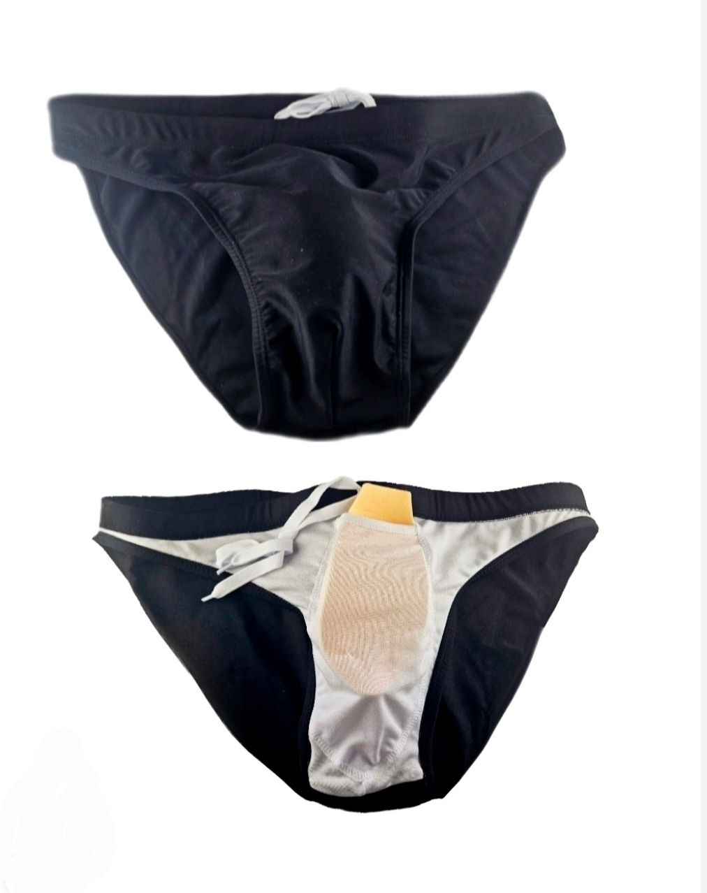 Man kann die Badehose mit dem Pad anziehen, damit es vorne nach mehr aussieht